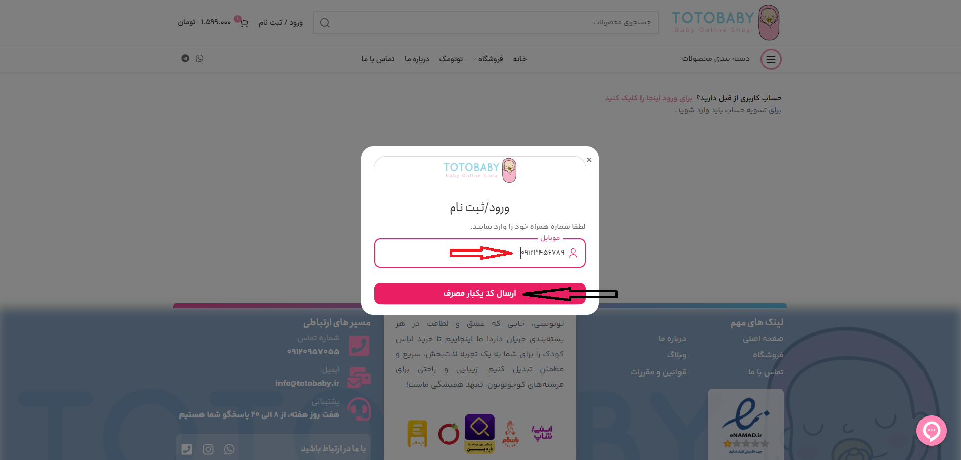 ۵. 📱 شماره تلفن همراه خود را در کادر مربوطه وارد کرده و سپس روی دکمه “ارسال کد یکبار مصرف” کلیک کنید.