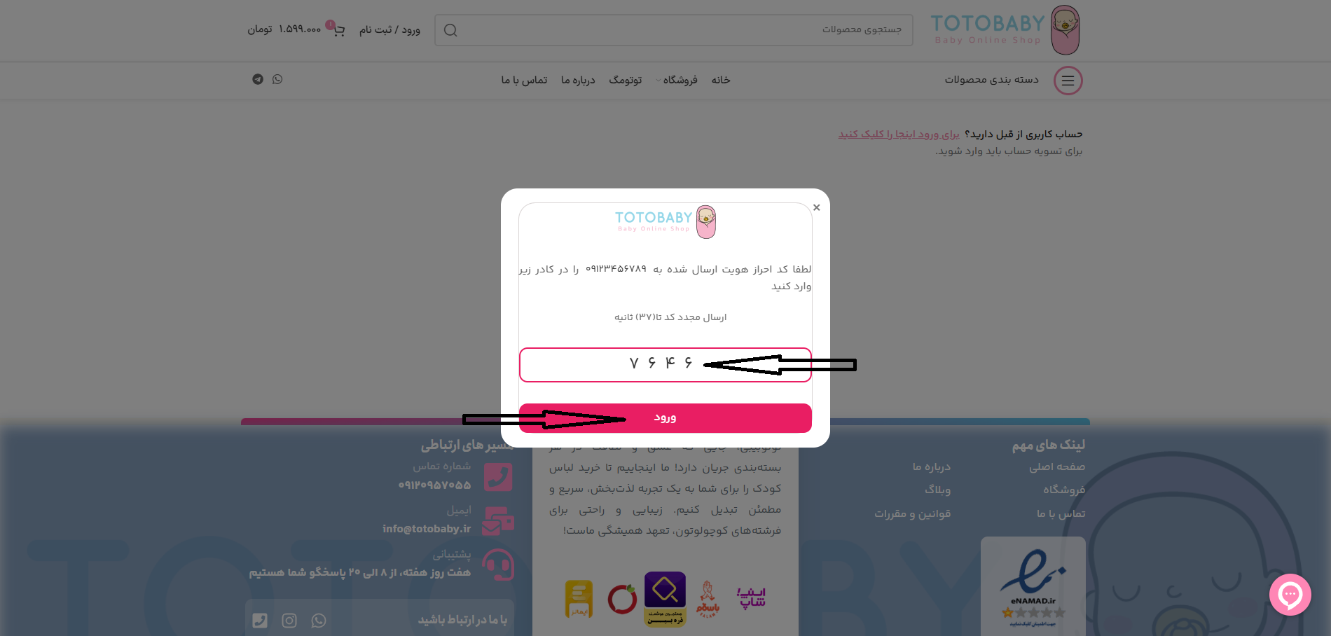 ۶. 🔑 کدی را که از طریق پیامک دریافت کردهاید، در کادر مشخص شده وارد کرده و سپس روی دکمه “ورود” کلیک نمایید.