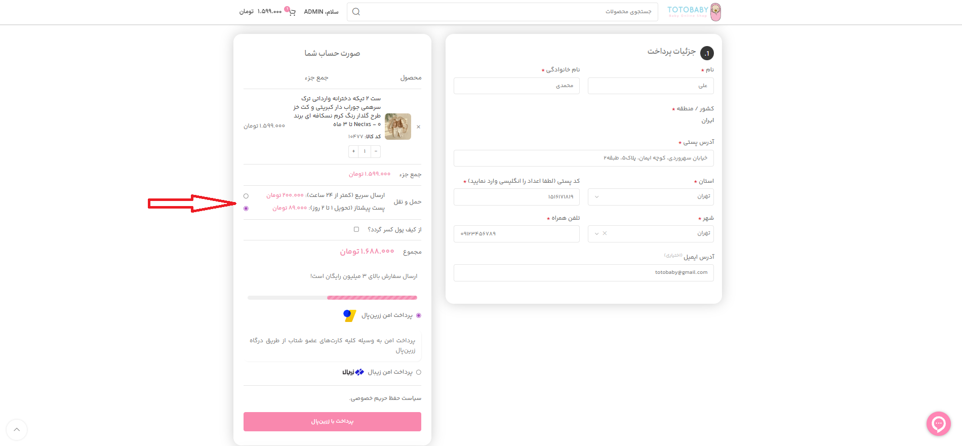 ۷. 📝 در قسمت سمت راست صفحه تسویه حساب، تمام فیلدهای ضروری شامل نام، نام خانوادگی، آدرس دقیق، استان، شهر، کد پستی و شماره همراه را تکمیل کنید.
