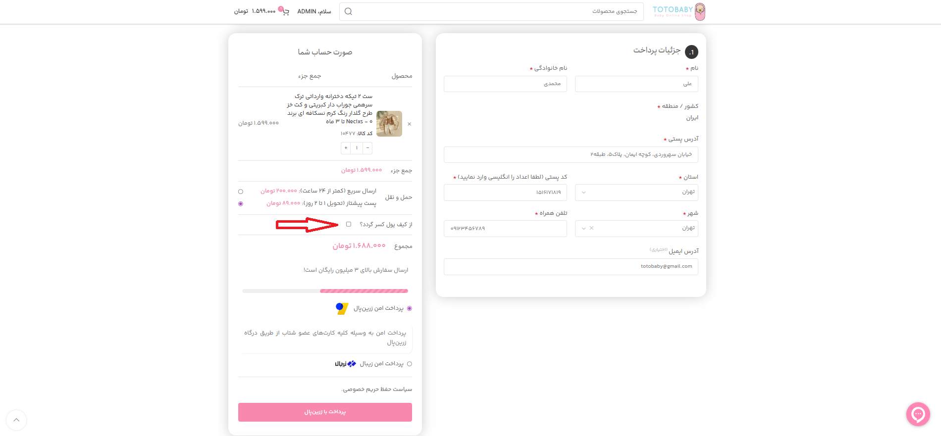 ۹. 💰 در صورتی که در کیف پول خود موجودی دارید و مایل به استفاده از آن هستید، تیک کنار گزینه مربوطه را فعال کنید.