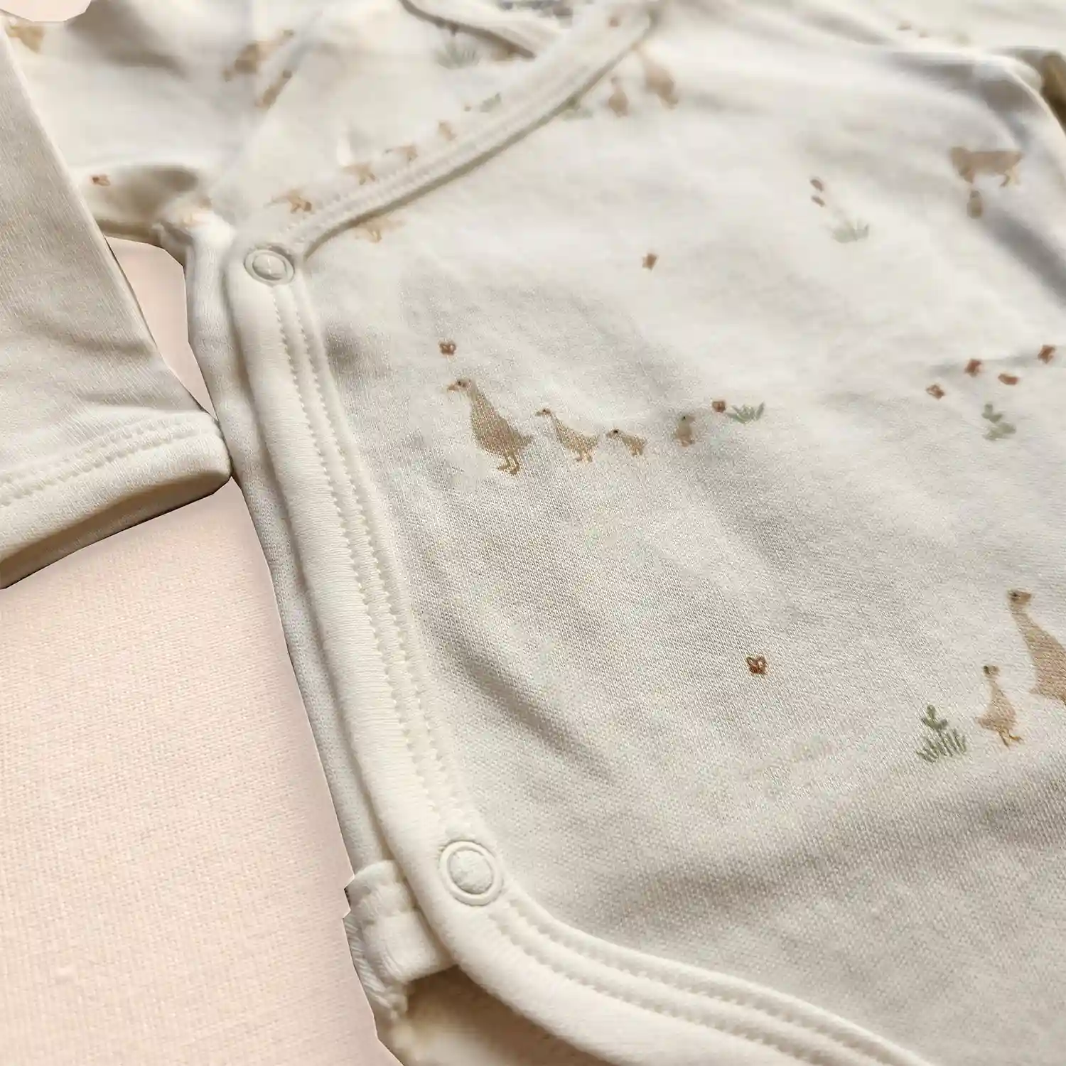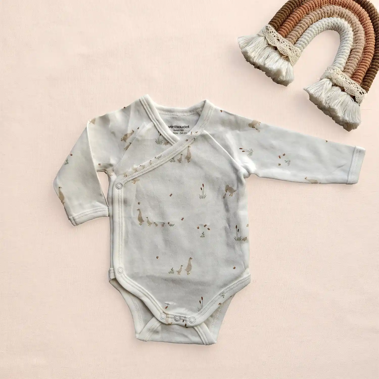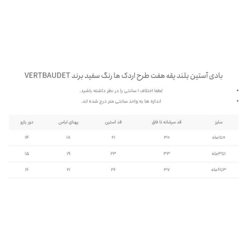 در قسمت پایین لباس، دکمههای فشاری باکیفیت قرار گرفته که تعویض پوشک را سریع و آسان میکند. برند فرانسوی ورت بایودت که دفتر مرکزی آن در شهر تورکُن فرانسه واقع است، یکی از برترین تولیدکنندگان لباس نوزاد، کودک و مادر باردار در اروپاست و محصولاتش به خاطر دوخت دقیق، دوام بالا و طراحیهای کاربردی شهرت دارند.