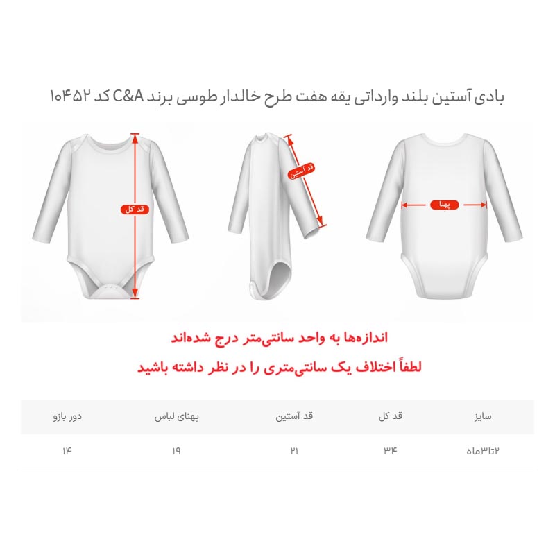 این محصول وارداتی و اورجینال از برند C&A بوده و از نخ پنبهای باکیفیت و لطیف تولید شده که مناسب پوست حساس نوزاد است و هیچگونه حساسیت یا تعریق ایجاد نمیکند. طراحی آستین بلند و یقه هفت باعث شده استفاده از این بادی در فصول خنک سال راحت و کاربردی باشد و تعویض پوشک نیز با دکمههای زیر کار بسیار آسان شود.