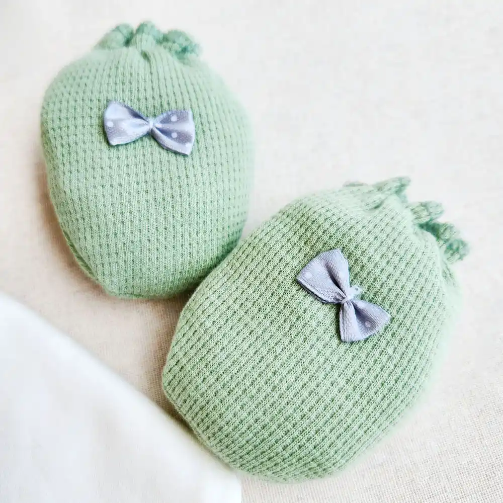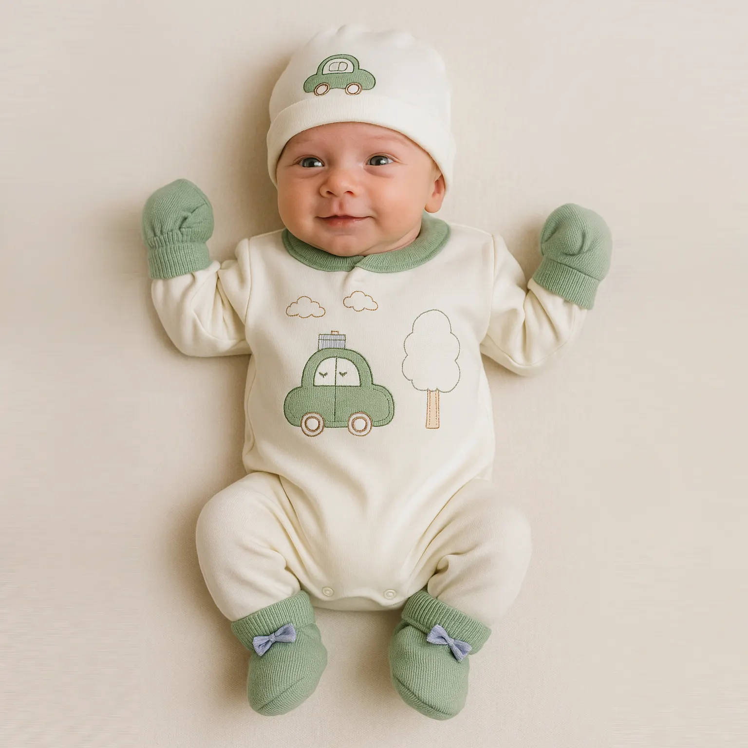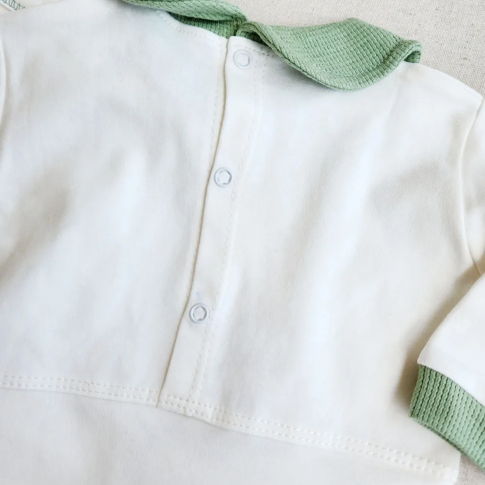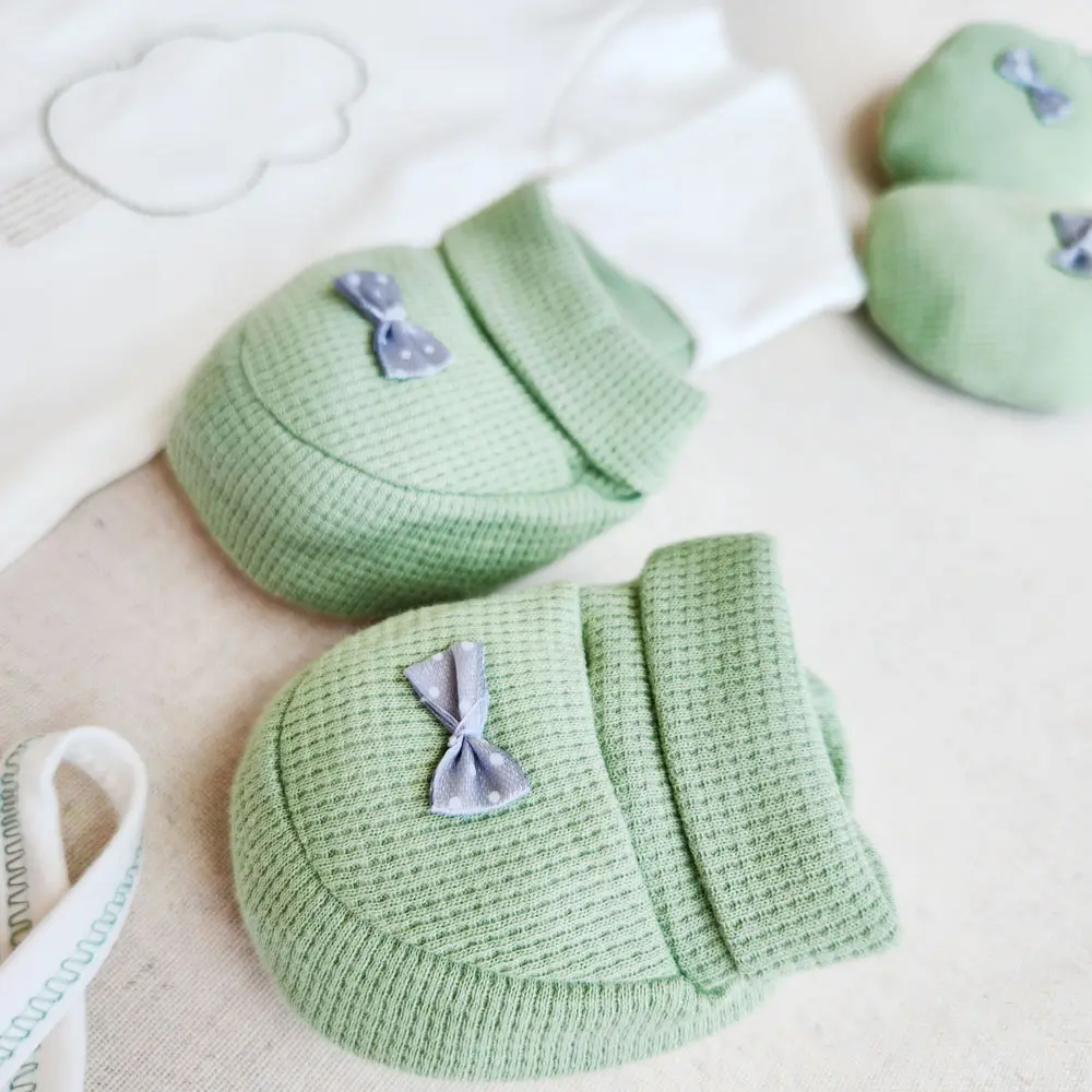 جزئیات دقیق: دور یقه و کش شلوار به رنگ سبز، پاپوش و دستکشهای سبز با پاپیونهای زیبا.