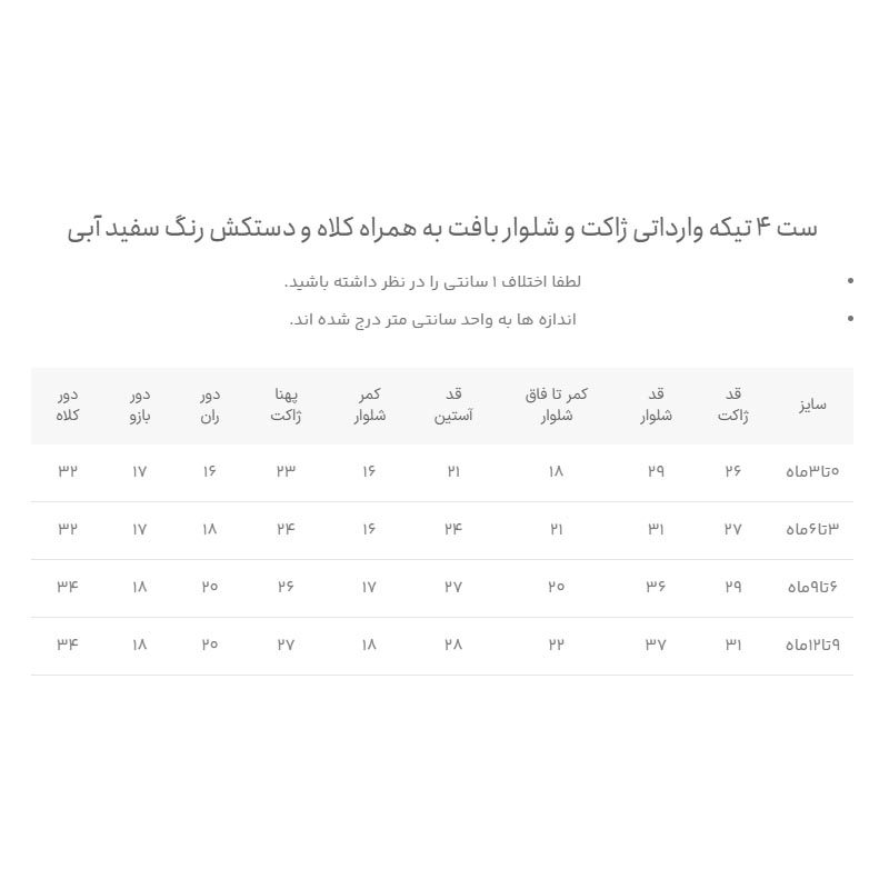 | سایز | قد ژاکت | قد شلوار | کمر تا فاق شلوار | قد آستین | کمر شلوار | پهنا ژاکت | دور ران | دور بازو | دور کلاه |