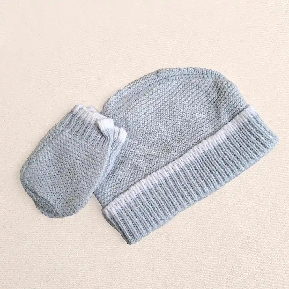 ست ۴ تیکه وارداتی ژاکت و شلوار بافت به همراه کلاه و دستکش رنگ سفید آبی برند اوبیبی
