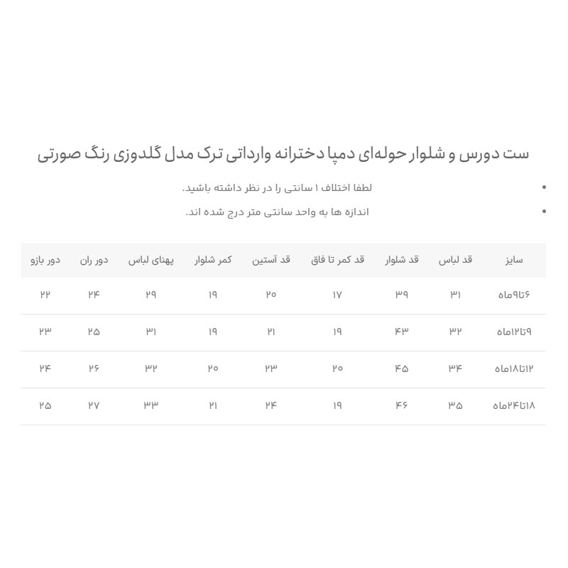 | سایز | قد لباس | قد شلوار | قد کمر تا فاق | قد آستین | کمر شلوار | پهنای لباس | دور ران | دور بازو |