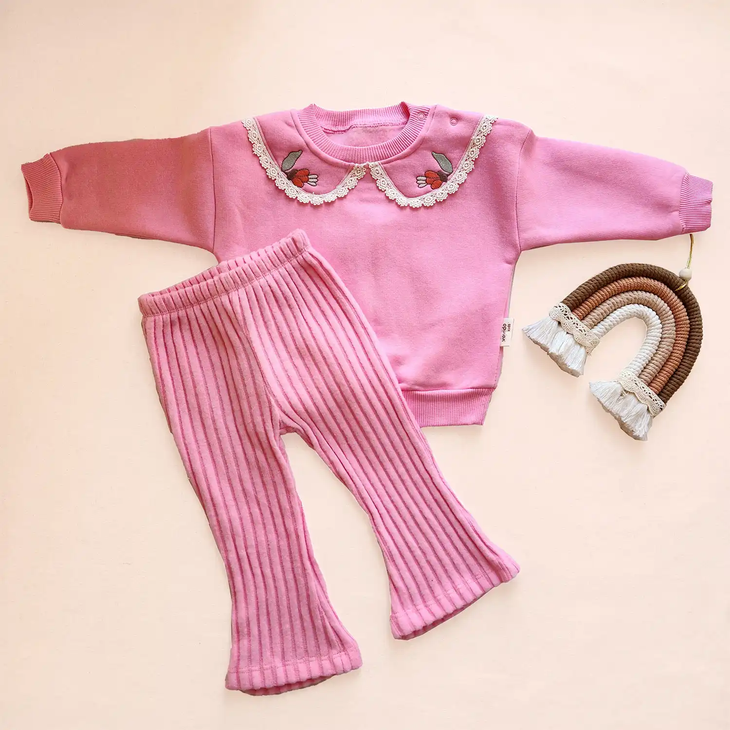 ست دورس و شلوار حولهای دمپا دخترانه وارداتی ترک مدل گلدوزی رنگ صورتی