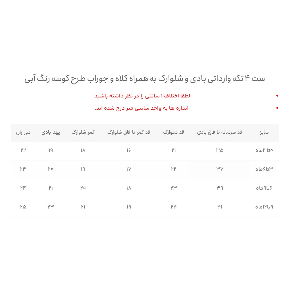 | سایز | قد سرشانه تا فاق بادی | قد شلوارک | قد کمر تا فاق شلوارک | کمر شلوارک | پهنا بادی | دور ران |