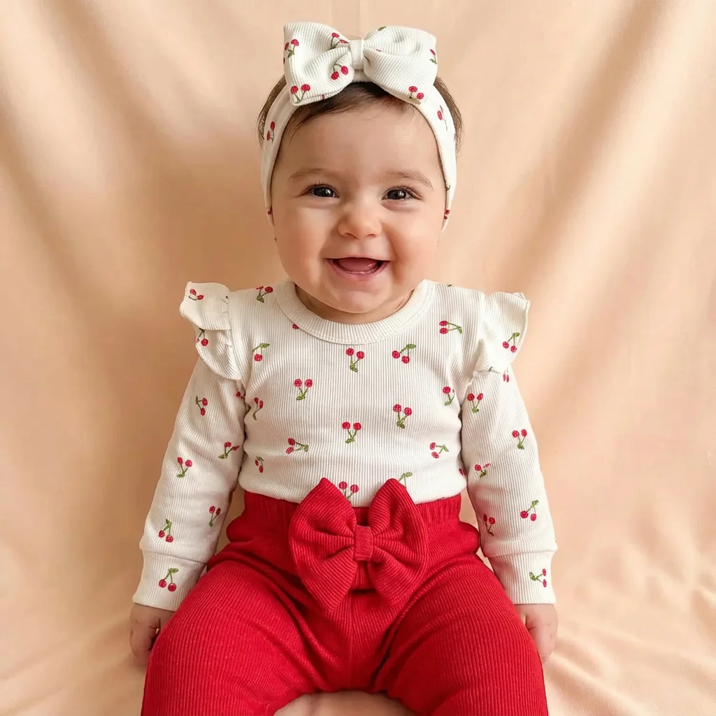 ست بادی آستین بلند کبریتی و شلوار به همراه هدبند طرح آلبالو