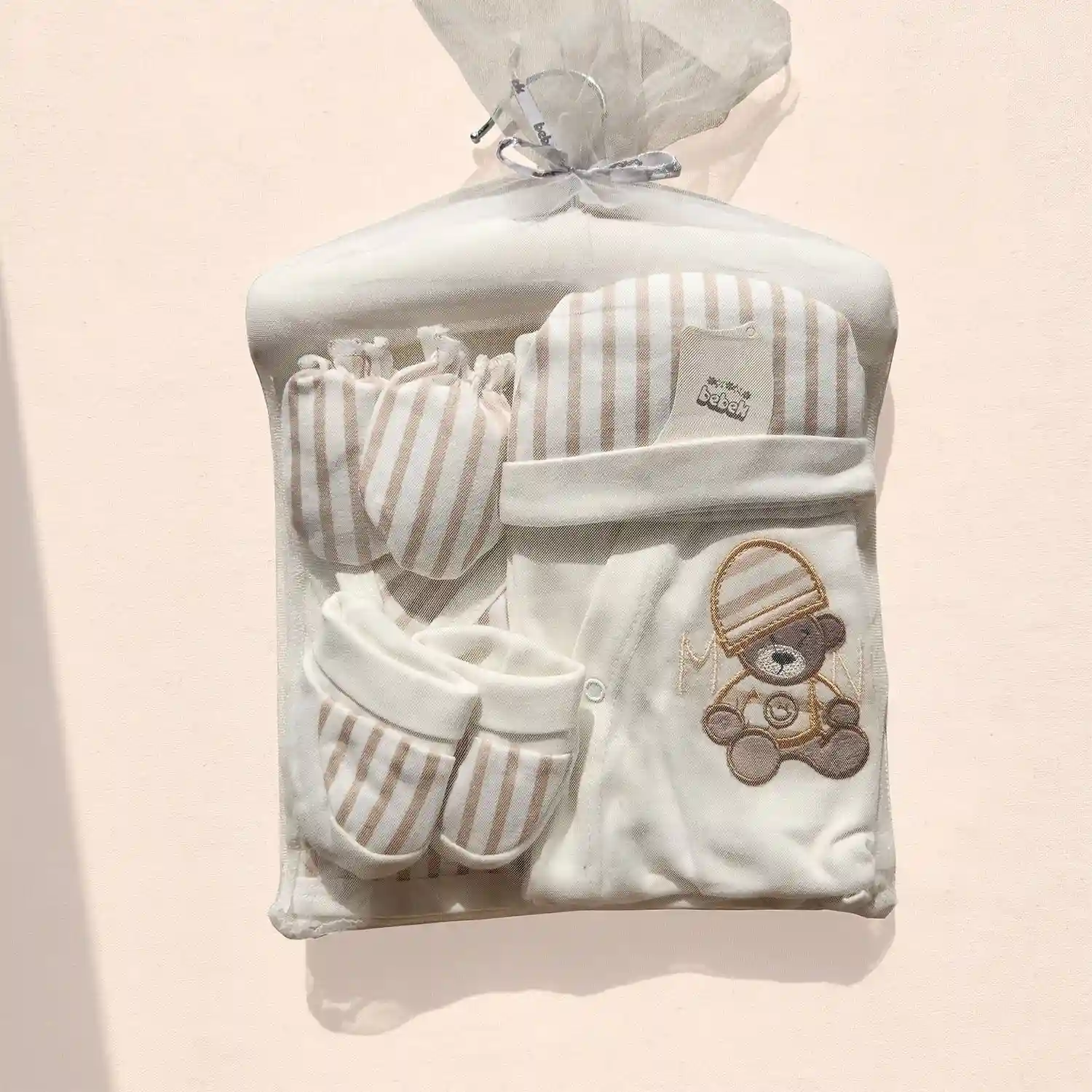 ست بیمارستانی طرح خرسی مدل راهراه رنگ سفید برند ببک یک ست ۶ تکه جذاب، اسپرت و مناسب برای نوزادان دختر و پسر است. این ست شامل سرهمی، دورپیچ، پیشبند، کلاه، پاپوش و دستکش بوده و با پارچه نرم و ضدحساسیت، راحتی کامل نوزاد را در روزهای اول زندگی فراهم میکند. طرح خرسی همراه با راهراه سفید، ظاهری مینیمال و شیک ایجاد کرده و آن را به انتخابی عالی برای بیمارستان و روزهای نخست تولد تبدیل میکند. برای دیدن پرفروشترین مدلها و انتخاب بین جدیدترین طرحها، همین حالا به این صفحه سر بزنید:
