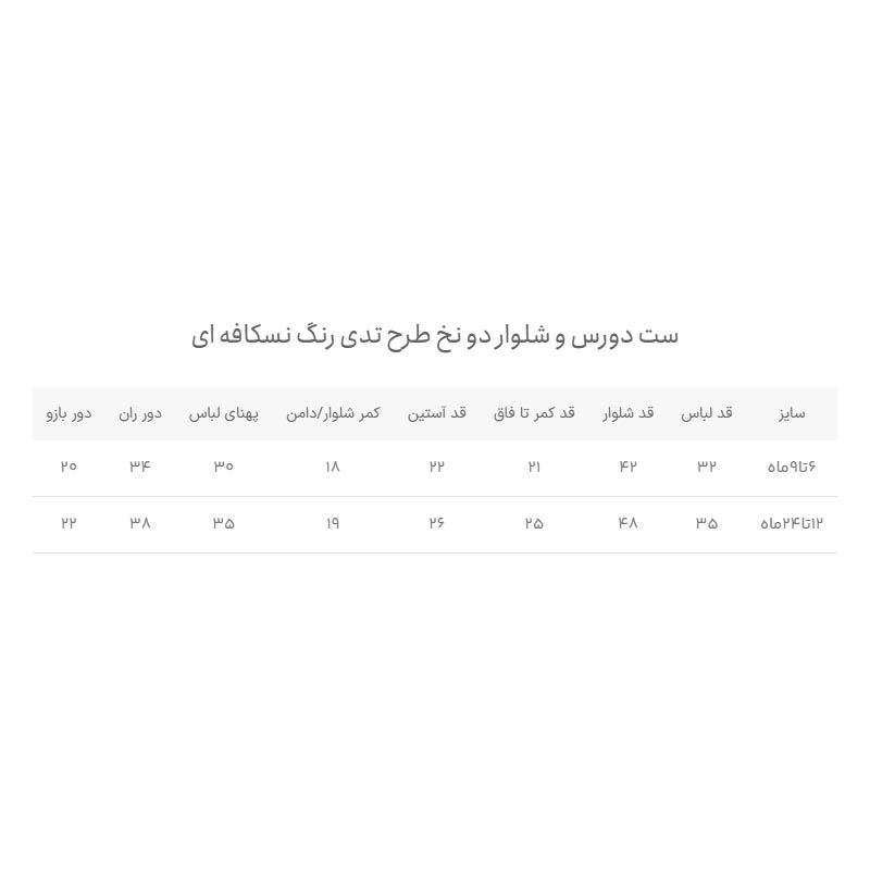 | سایز | قد لباس | قد شلوار | قد کمر تا فاق | قد آستین | کمر شلوار/دامن | پهنای لباس | دور ران | دور بازو |