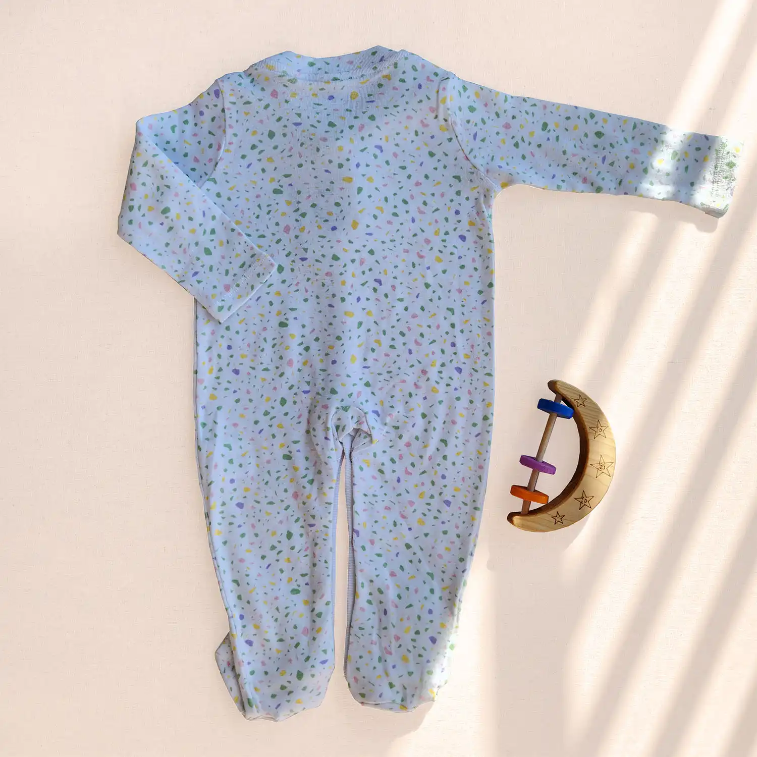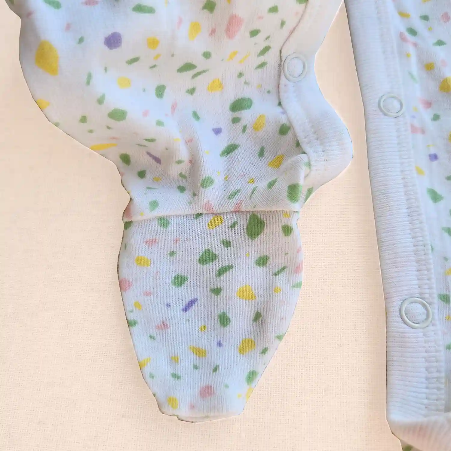 این سرهمی با طراحی خاص و رنگ سفید جذاب همراه با طرحهای رنگپاشی، ظاهری شاد و کودکانه به نوزاد میدهد. وجود جوراب متصل در طراحی آن، نیاز به جوراب جداگانه را از بین میبرد و باعث میشود پای نوزاد همیشه گرم و پوشیده بماند.