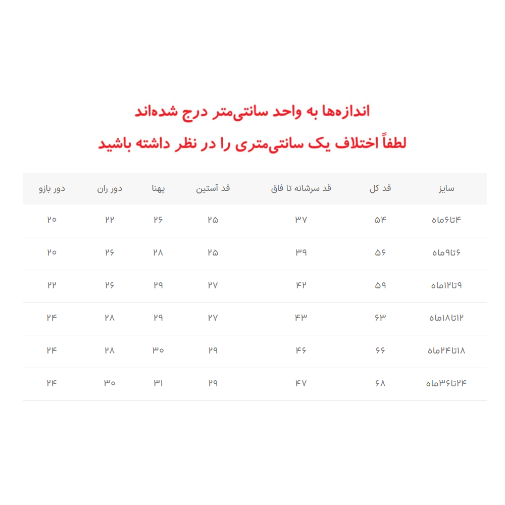 | سایز | قد کل | قد سرشانه تا فاق | قد آستین | پهنا | دور ران | دور بازو |