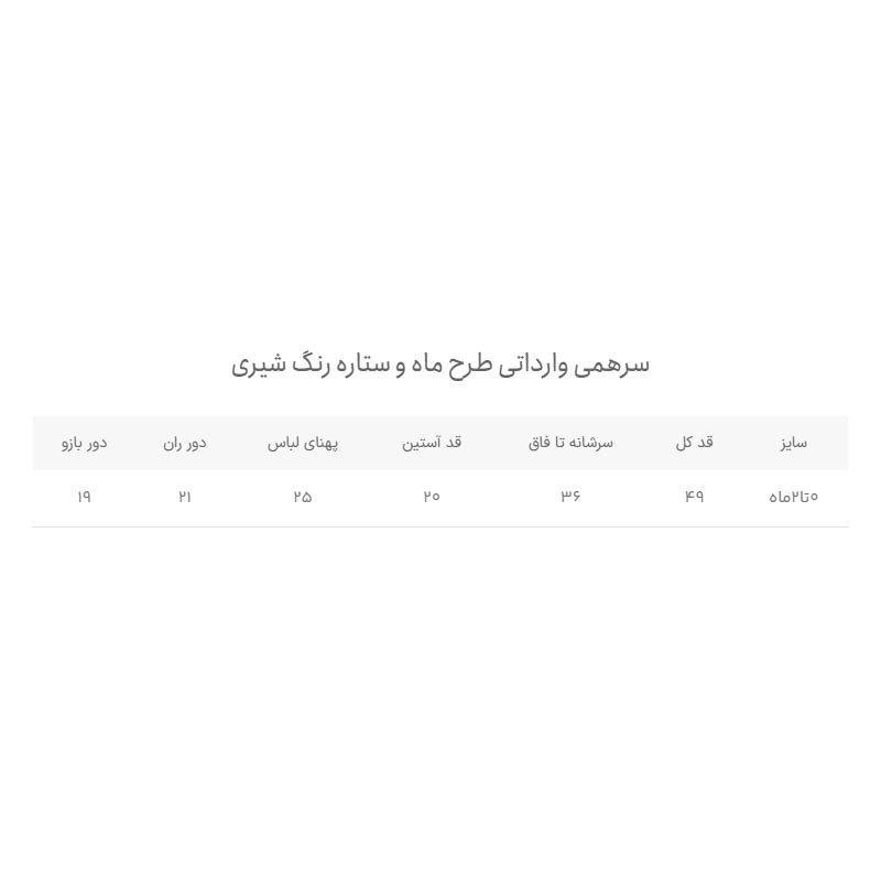| سایز | قد کل | سرشانه تا فاق | قد آستین | پهنای لباس | دور ران | دور بازو |