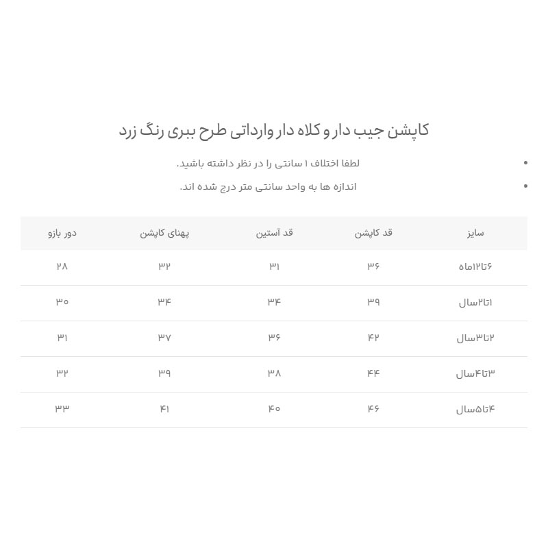 | سایز | قد کاپشن | قد آستین | پهنای کاپشن | دور بازو |