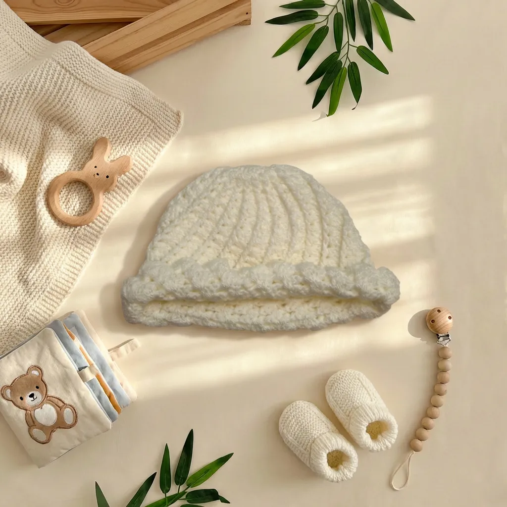 کلاه نوزادی دست بافت رنگ شیری کد ۱۰۴۸۱